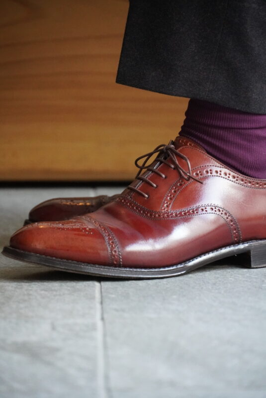 Gozovation前でバーガンディーのコードバン ES-06を履いているオーナーがダークブラウンのスーツ姿で立っている様子