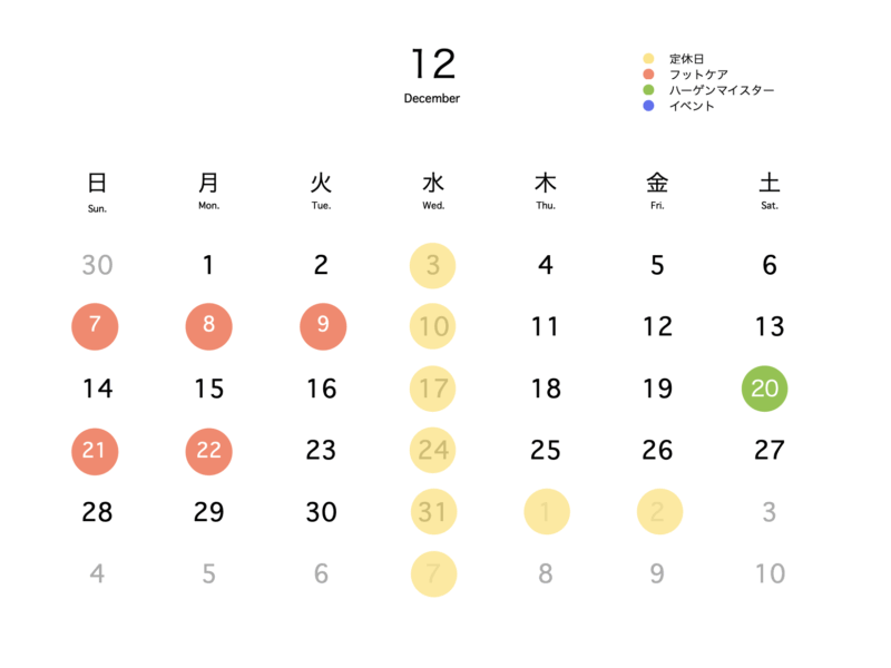 12月の店休日:3日・10日・17日・24日・31日の毎週水曜日にお休みをいただきます。